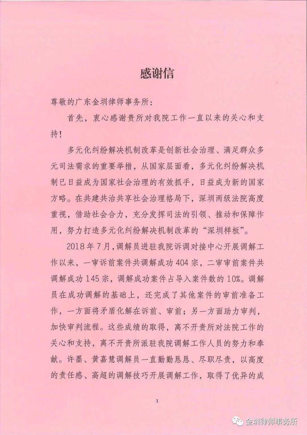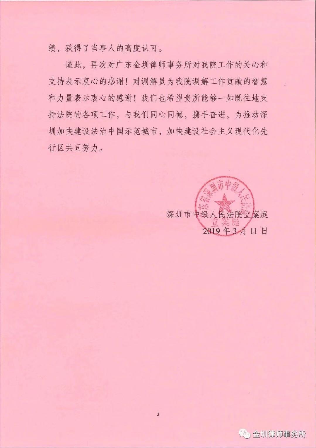 深圳市中级人民法院感谢信